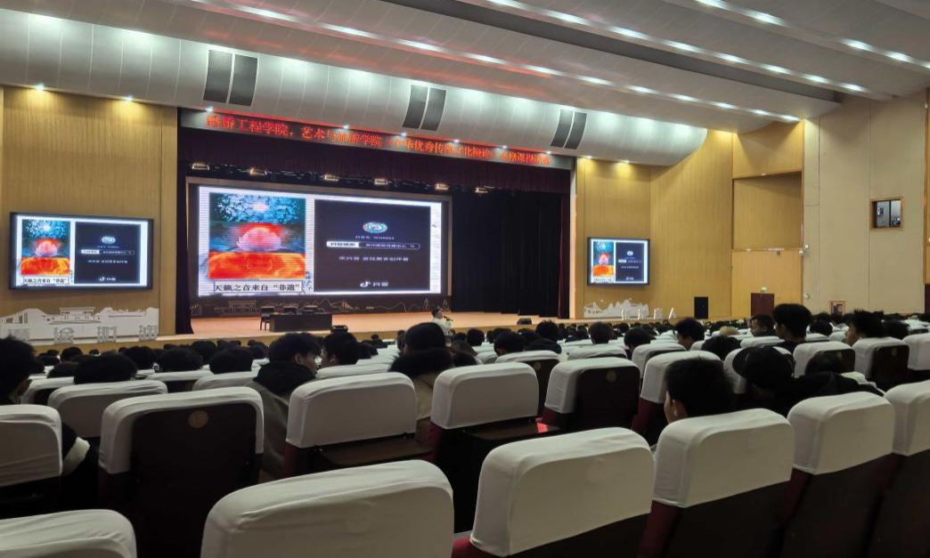 课程伊始,邱桐博士以热门电影《流浪地球》中“带着地球去流浪”作为切入点,剖析其背后所蕴含的“安土重迁、眷恋家园”的中华农耕文明特质,激发学生探寻文化根源的兴趣。随后,他带领学生步入“思想的星空”,系统阐释儒家“仁爱”思想,从血亲之爱扩展至人际关爱、自然敬畏与自我尊重,引导学生在外界关怀中学会珍视自身价值。最后,邱桐博士还引领学生在古典诗词中寻觅古代“交通人”的足迹,品读驿路行旅篇章中蕴含的坚韧精神与工程美学;从中国书画的笔法结构与色彩布局中,解读其与“结构力学”“空间构图”之间的艺术相通性。在“科技智慧”环节,他从榫卯结构的“阴阳和合”“以柔克刚”,讲到都江堰水利工程的“因势利导”“系统思维”,并延伸至花江峡谷大桥建设中所体现的“守正创新”与“和谐共生”,生动展现传统文化在古今工程建设中的智慧延续与现实价值。