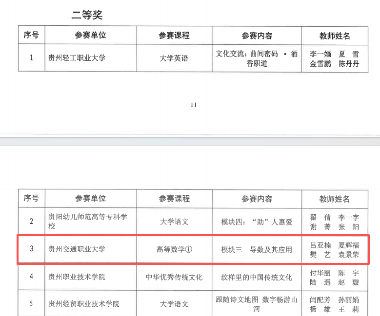 近日,2025 年贵州省职业院校技能大赛教学能力比赛圆满落幕。本次大赛作为我省职业教育领域教学能力展示与交流的重要平台,汇聚了全省各职业院校的优秀教学团队,竞争异常激烈。最终,我院数理教研室吕亚楠、夏辉福、樊艺、袁景荣教师团队凭借在《高等数学》课程中的扎实教学功底、创新教学理念与出色团队协作,斩获大赛高职公共课程组二等奖。