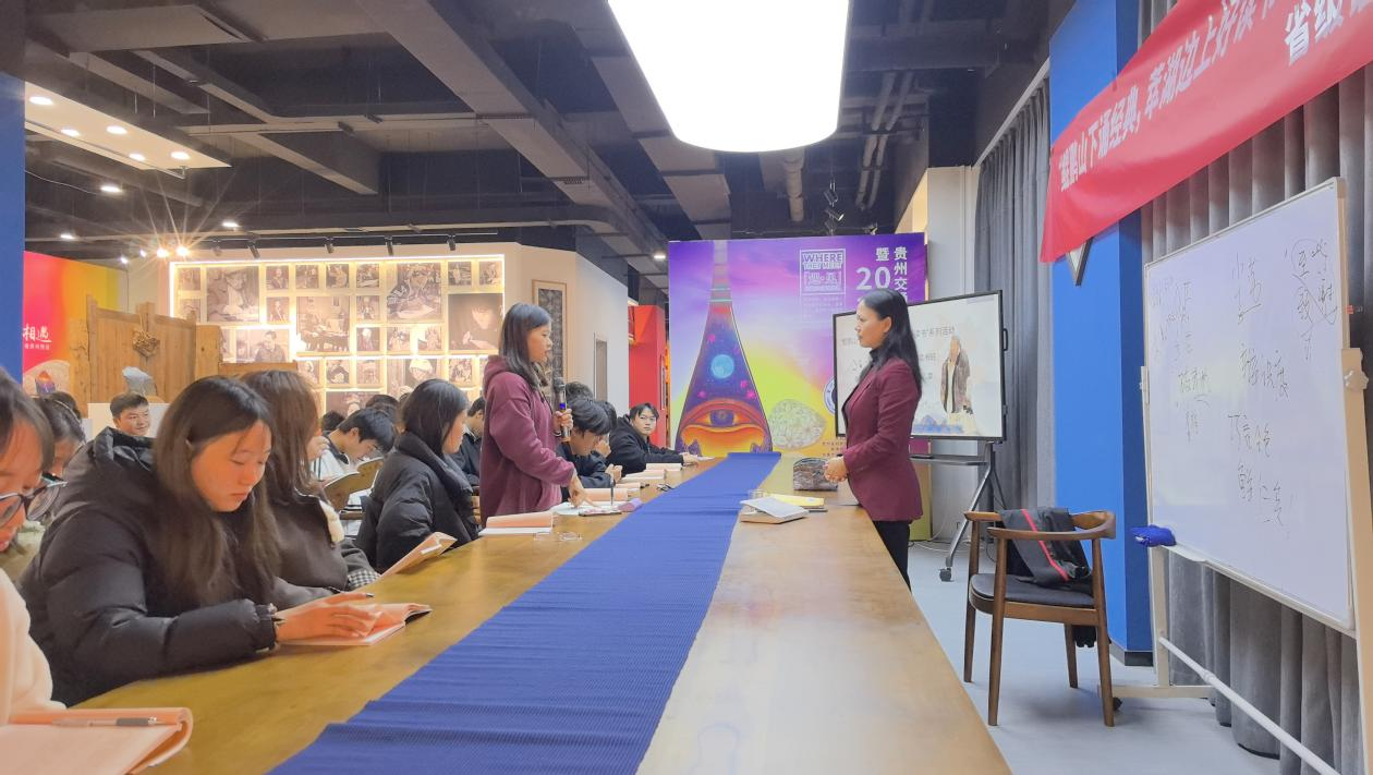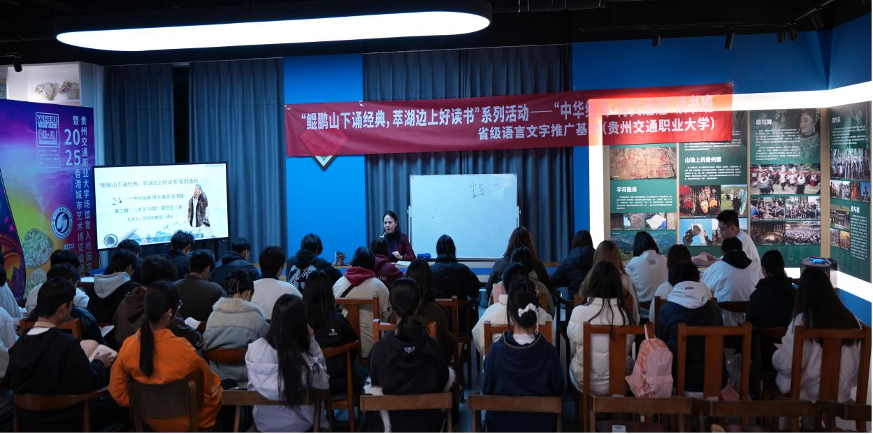 11月12日,由省级语言文字推广基地(贵州交通职业大学)主办,通识教育学院和图书馆联合承办的“中华经典·博文通途”读书班第二期活动在文化千岛艺术馆内开讲。本期读书班仍由贵州交通职业大学副校长、教授、博士贺梦依主讲,带领师生一起走进《大学》第四至第八章,探寻一条“诚意正心”“德润其身”的现代君子养成之路。