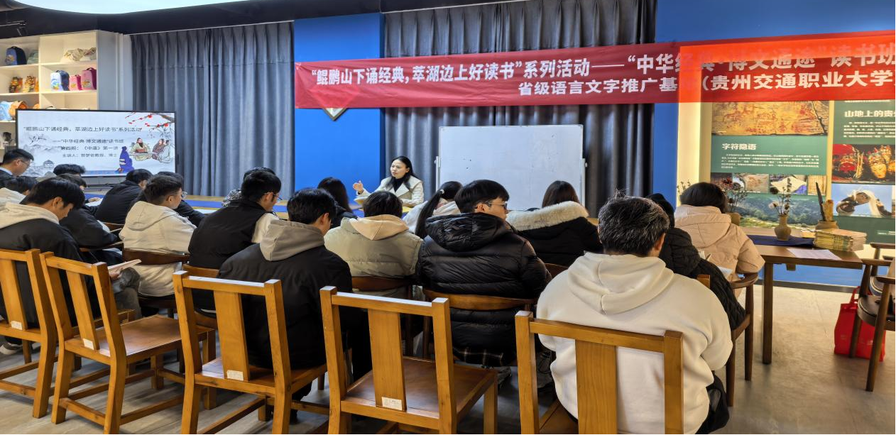 12月29日,由省级语言文字推广基地(贵州交通职业大学)主办,通识教育学院与图书馆联合承办的“中华经典·博文通途”读书班第四期活动在文化千岛艺术馆举行。贵州交通职业大学副校长、教授、博士贺梦依继续带领师生共读《中庸》前四章,开展一场关于“中和之道”与当代人格养成的思想对话。