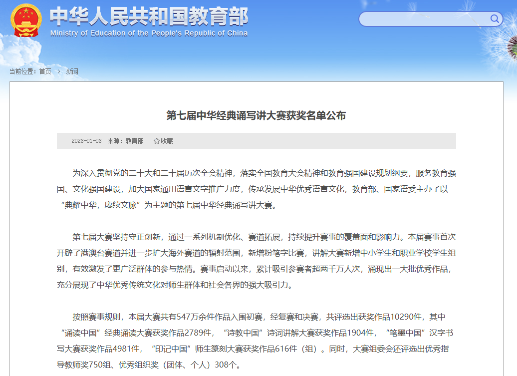 此次获奖,不仅是沈松钦老师个人专业能力的体现,也是我校长期以来高度重视中华优秀传统文化教育、注重教师教学能力培养的成果缩影。未来,学校将持续鼓励和支持广大教师深耕教学、传承经典,努力提升学生语言文化素养和综合素质水平,为培养担当民族复兴大任的时代新人贡献力量。